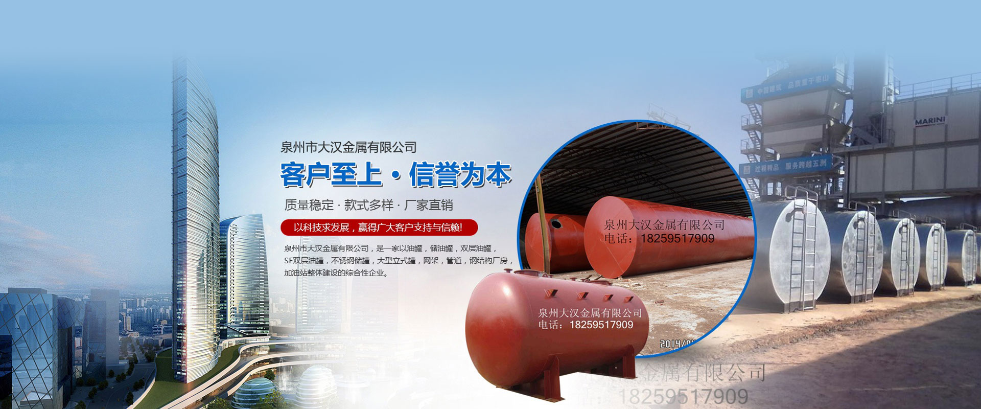泉州市大漢金屬有限公司,是一家以油罐、儲(chǔ)油罐、雙層油罐、SF雙層油罐、不銹鋼儲(chǔ)罐、大型立式罐、網(wǎng)架、管道、鋼結(jié)構(gòu)廠房、加油站整體建設(shè)的綜合性企業(yè)。本公司以技術(shù)人員、施工經(jīng)驗(yàn)豐富的工程隊(duì)、自動(dòng)化設(shè)備、擁有鋼結(jié)構(gòu)建筑、螺栓球網(wǎng)架設(shè)計(jì)安裝技術(shù)力量,嚴(yán)格按照國家容器標(biāo)準(zhǔn)制造,是一家產(chǎn)品開發(fā)并生產(chǎn)各種壓力容器和制造金屬結(jié)構(gòu)工程,化工石油工程安裝的大型企業(yè)。近多年來,以質(zhì)量穩(wěn)定、客戶至上、信譽(yù)為本,以科技求發(fā)展,贏得廣大客戶支持與信賴。